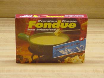 Complete Swiss fondue kit. Just empty contents into flame proof dish or pan. Heat, stirring until uniform consistency. Dip French or Italian bread cubes and enjoy! Contains white wine. 14 oz.